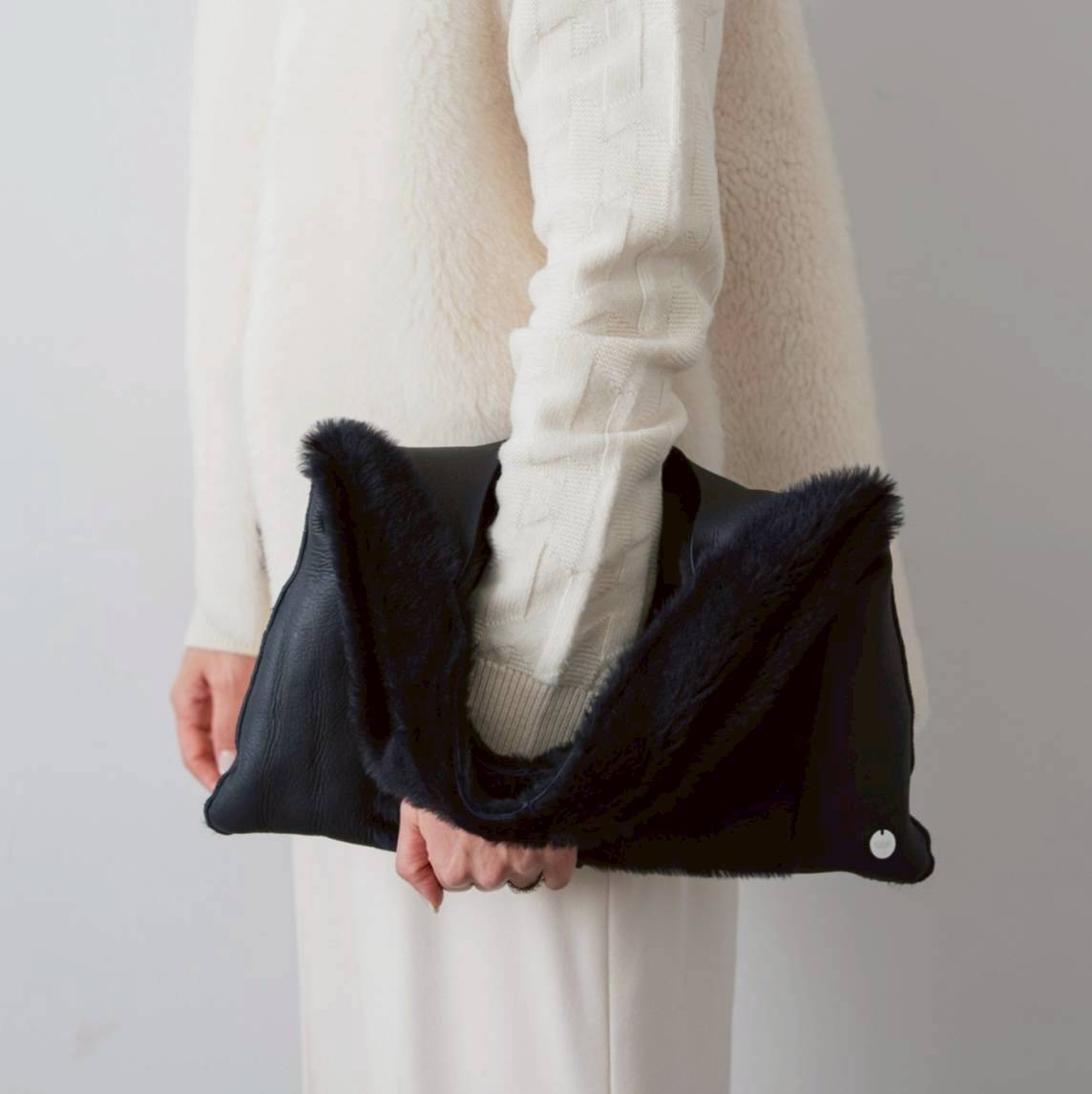 厚手のリアルムートン素材を贅沢に使用したリバーシブルでお使いいただけるトライアングルトートです。